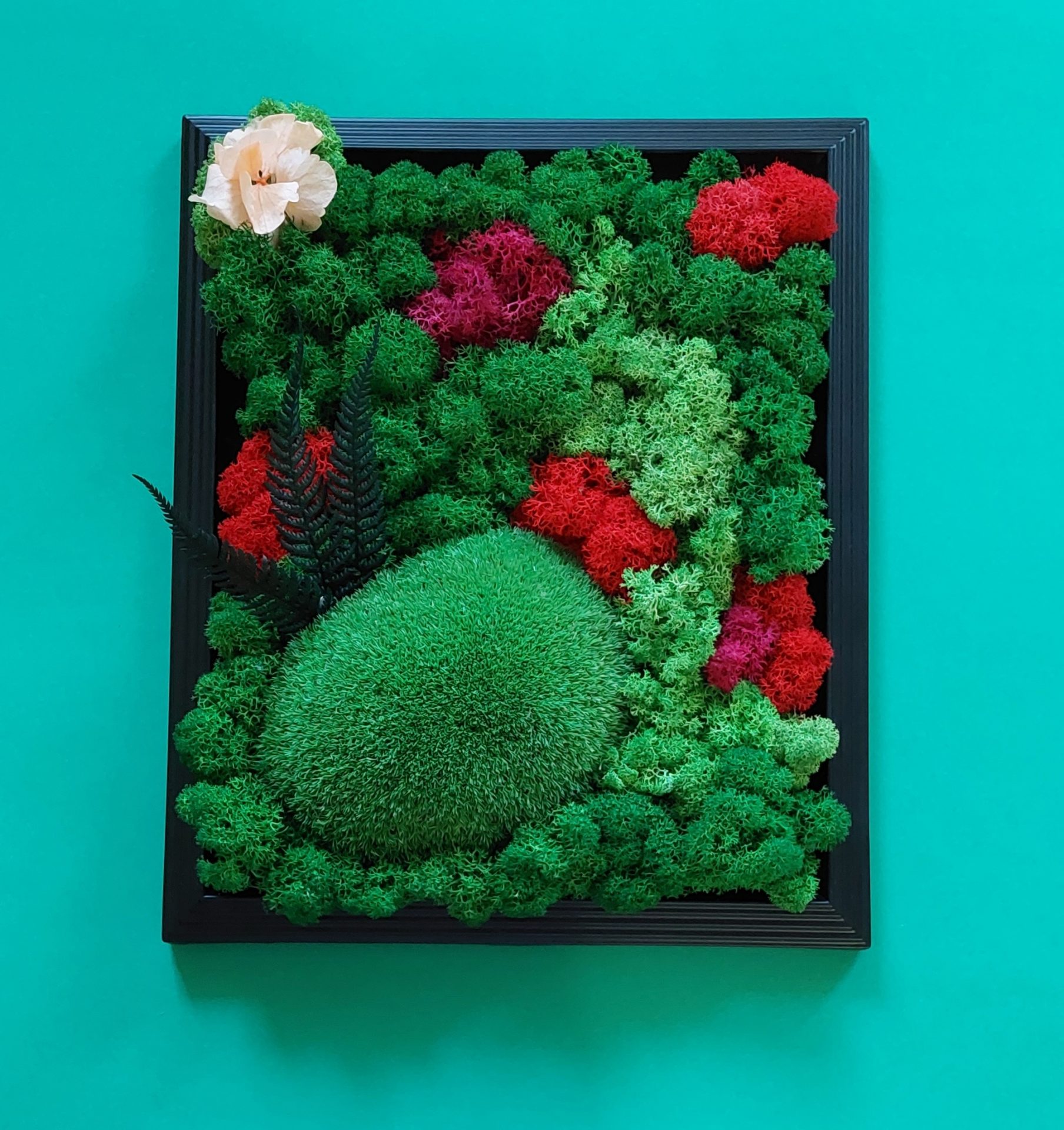 Tablou cu licheni stabilizați (verde închis, verde deschis, roșu, fuchsia), mușchi bombat și plante criogenate (ferigă verde și hortensie crem), ramă neagră de plastic ( 28 cm x 23.5 cm)