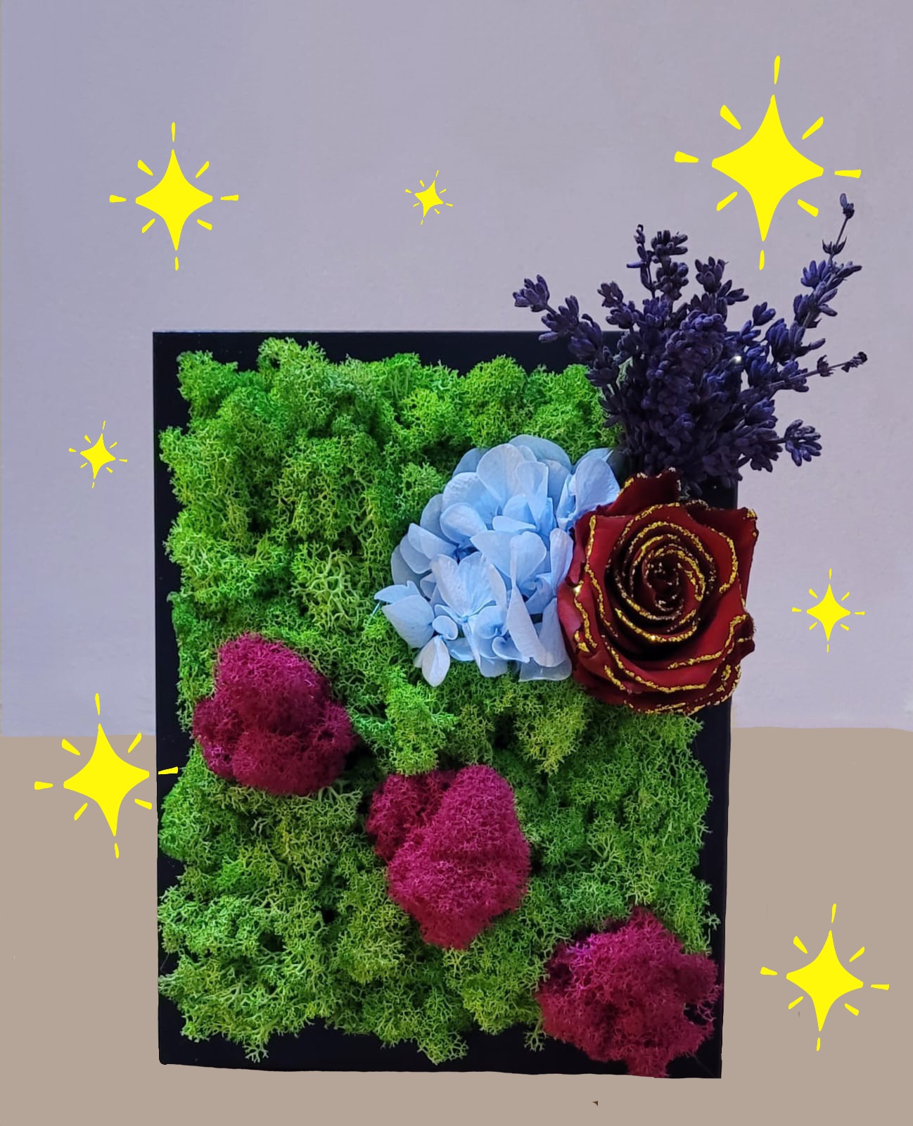 Specificații: Tablou cu licheni stabilizați și plante criogenate (trandafir , hortensie și lavandă)